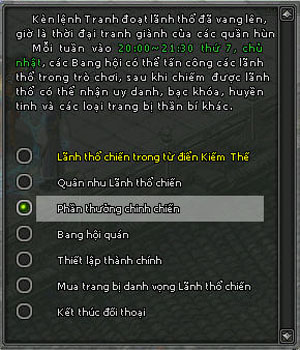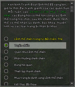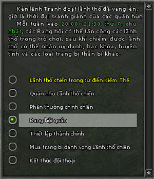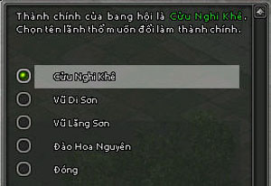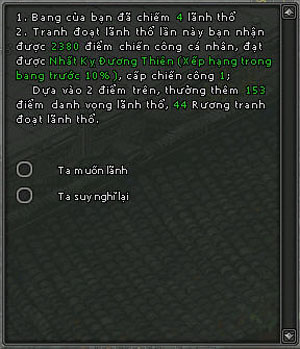 - Sau khi hết thời gian ngừng chiến, bang chủ có thể đối thoại với Quan Lãnh Thổ để xin thiết lập thành chính.