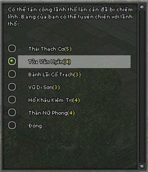 - Nếu chưa chiếm được lãnh thổ, hoặc lần đầu tham gia lãnh thổ chiến, thì chỉ được tuyên chiến ở Tân Thủ Thôn.
