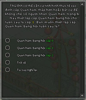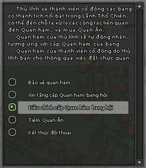 - Sau khi đã thiết lập Quan hàm bang hội, thì lúc 22h ngày thứ 2, hệ thống sẽ xét 10 thành viên có cổ phần cao nhất trong bang mà trao chức quan hàm tương ứng.